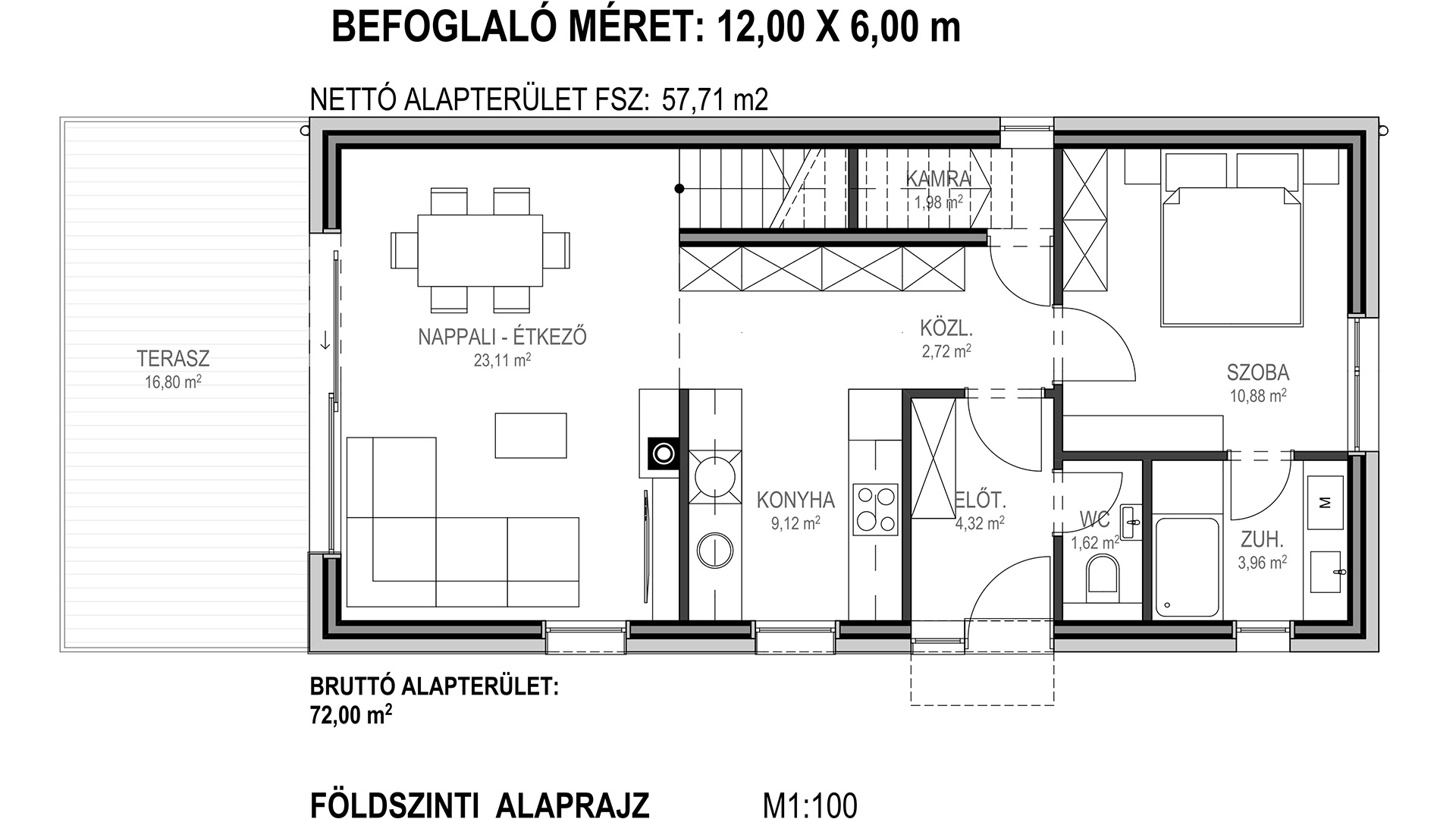 Össz. nettó alapterület (földszint+emelet): 92,56 m2