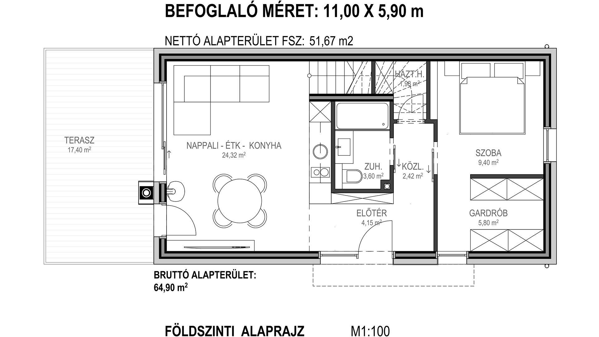 A minimalista megjelenésű DRÁVA házunkat praktikus és kényelmes otthonnak álmodtuk meg, amely jól kihasználható tereivel, helyiségeivel ideális egy két gyerekes család számára. A tetőtér beépítésével könnyen kialakítható két hálószoba és egy fürdőszoba, így igény esetén megoldható, hogy felsőbb „szint” a gyerekek birodalmává váljon. Az alsó részre betervezett hálószobába egy gardróbot is került, amellyel a helykihasználás még jobbá vált. Ezzel az elrendezéssel a közlekedő végén egy pici háztartási helyiséget is nyertünk, szerintünk ezzel az elosztással minden szempontból kényelmes otthon nyerhető.